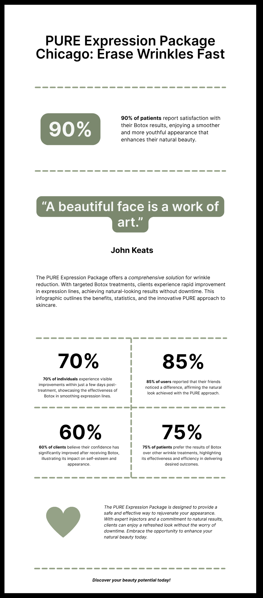 The PURE Expression Package Chicago was designed for exactly that. It’s a curated Botox package Chicago targeting the forehead, frown lines, and crow’s feet. With just one visit, you can look fresher, more rested, and years younger.
