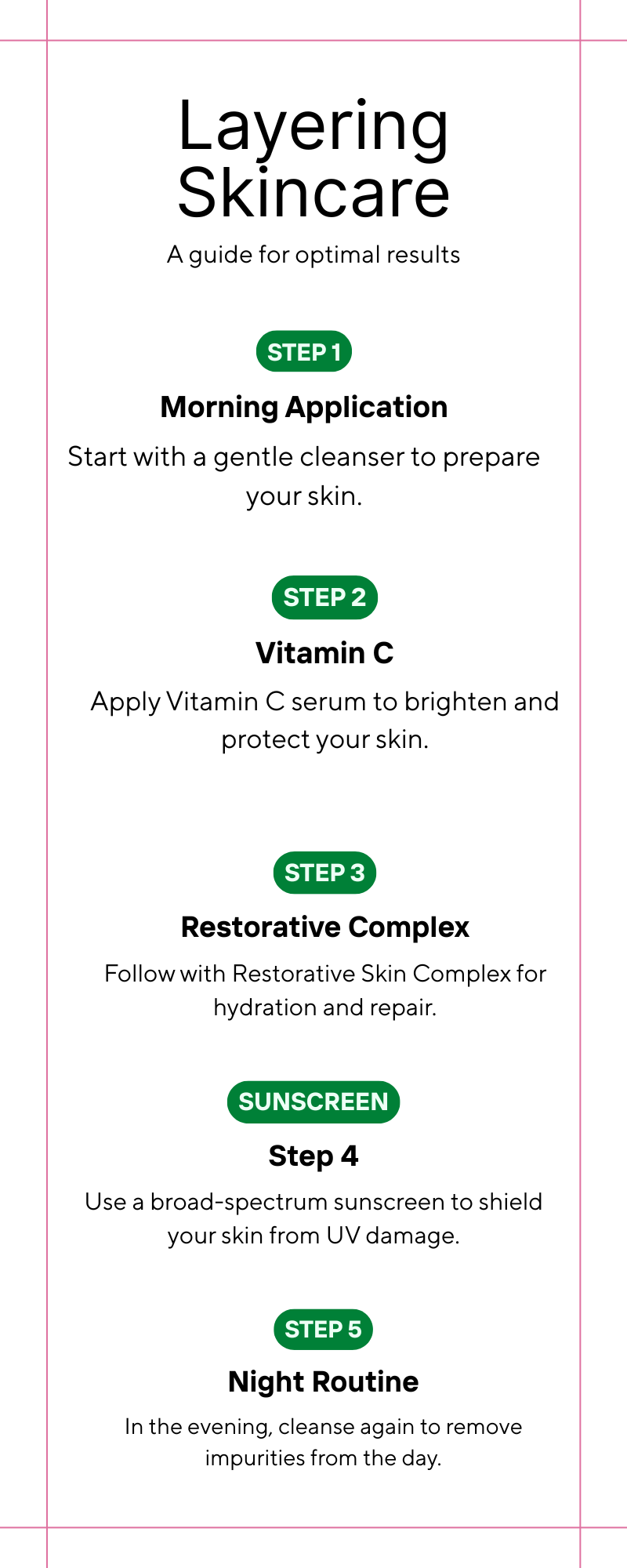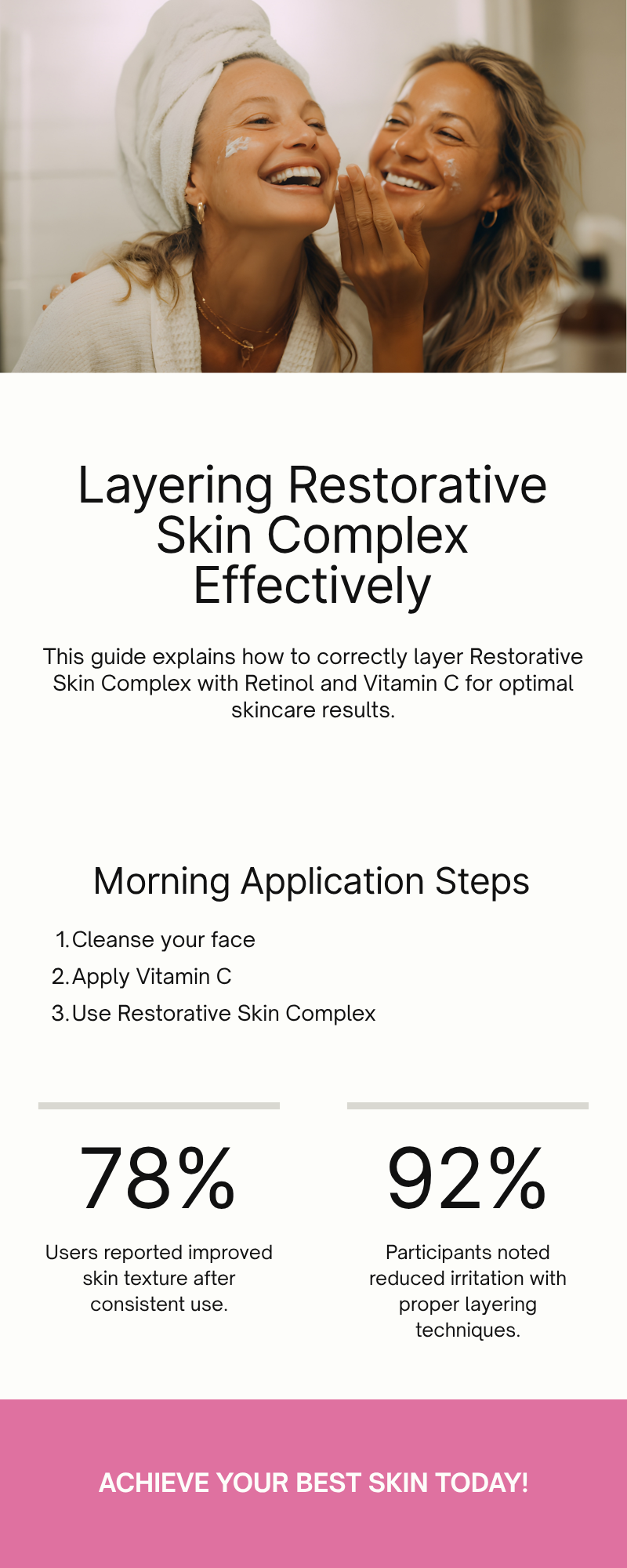 Knowing how to layer Restorative Skin Complex correctly is essential if you want to get the full benefit of its key ingredients while avoiding irritation. When used with retinol, vitamin C, and hyaluronic acid, it creates a routine that is both dermatologist approved and optimized for anti-aging.