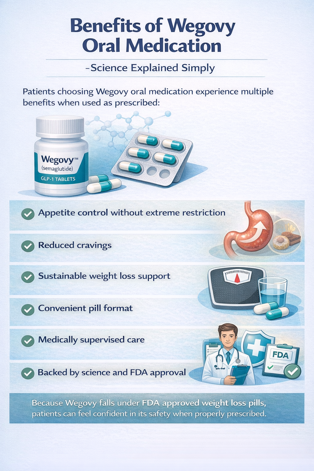 Wegovy oral medication is taken as prescribed and absorbed in a way that activates GLP-1 receptors responsible for appetite control. This makes it easier for patients to follow their treatment plan consistently.