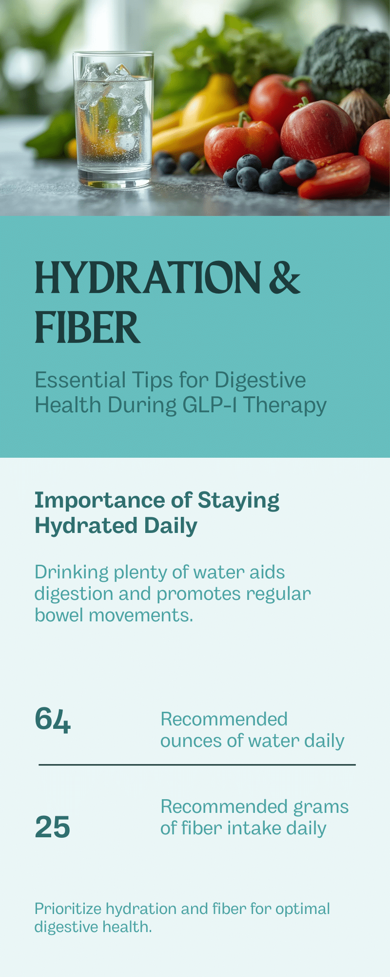 Fiber intake while on GLP-1 is just as important as hydration. Fiber adds bulk to stool and helps keep digestion moving regularly. However, suddenly increasing fiber too quickly can cause bloating.