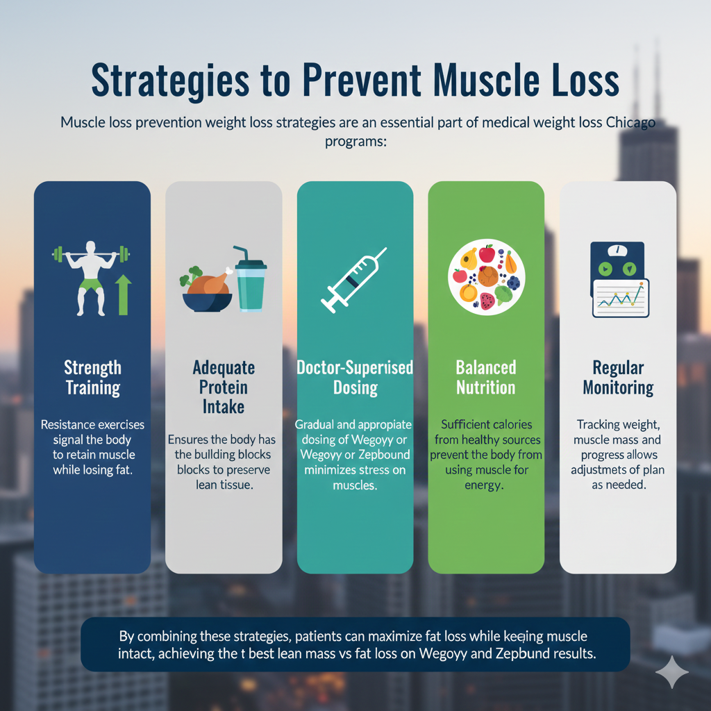Preventing muscle loss involves strength training, adequate protein, and doctor supervised weight loss Chicago programs to adjust dosing and nutrition appropriately.