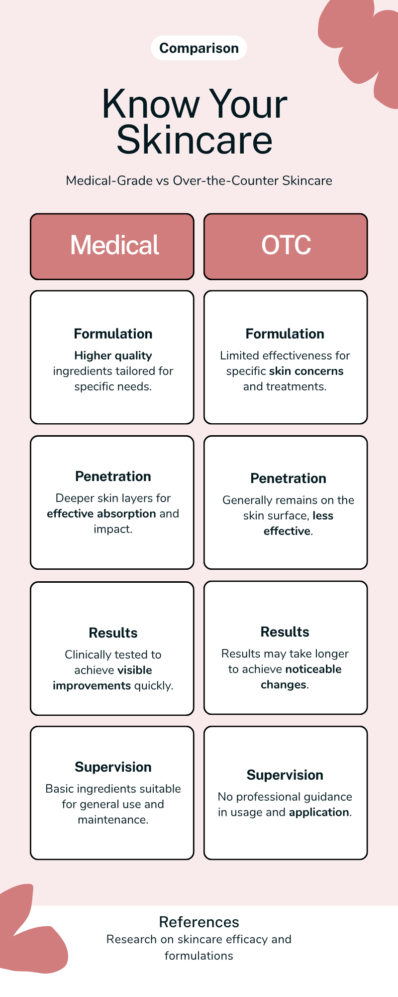 - Results: For issues like fine lines, acne scars, and pigmentation, medical-grade skincare typically outperforms over-the-counter options.