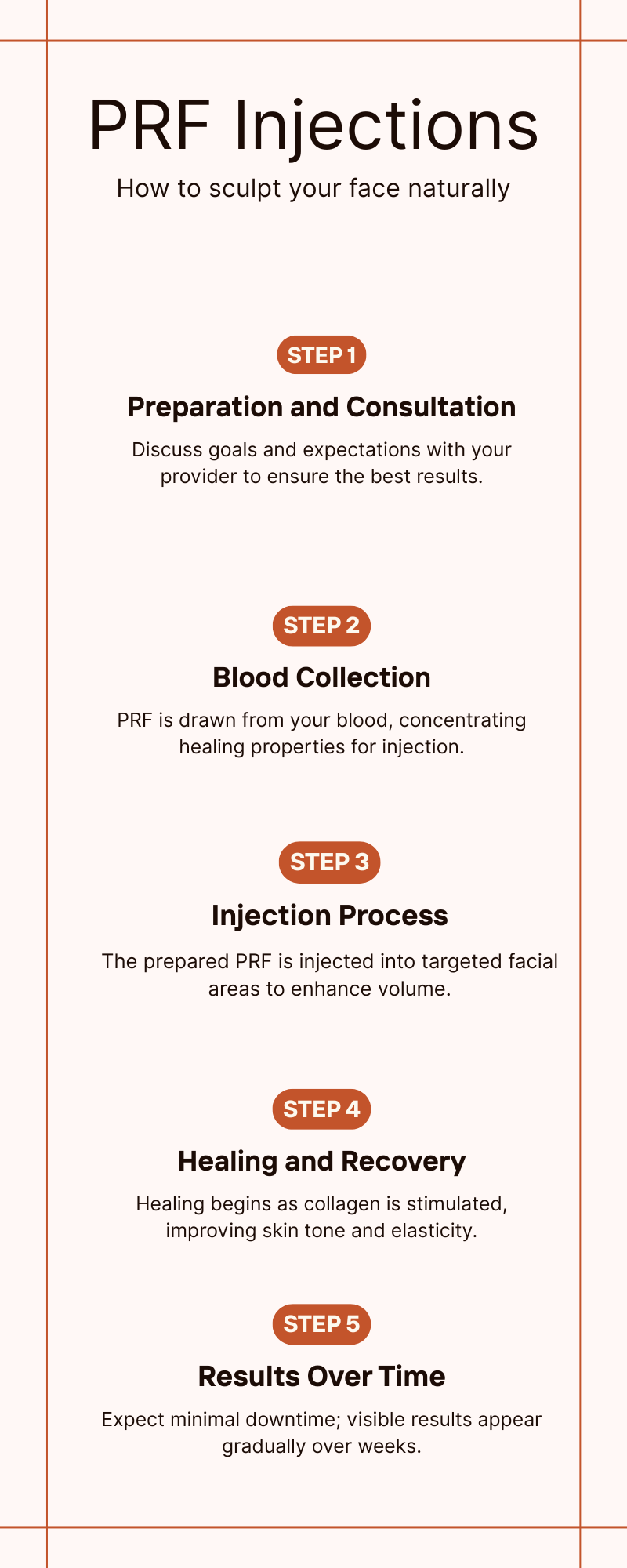 - Injecting the PRF into areas like under-eyes, cheeks, and jawline for natural facial contouring
