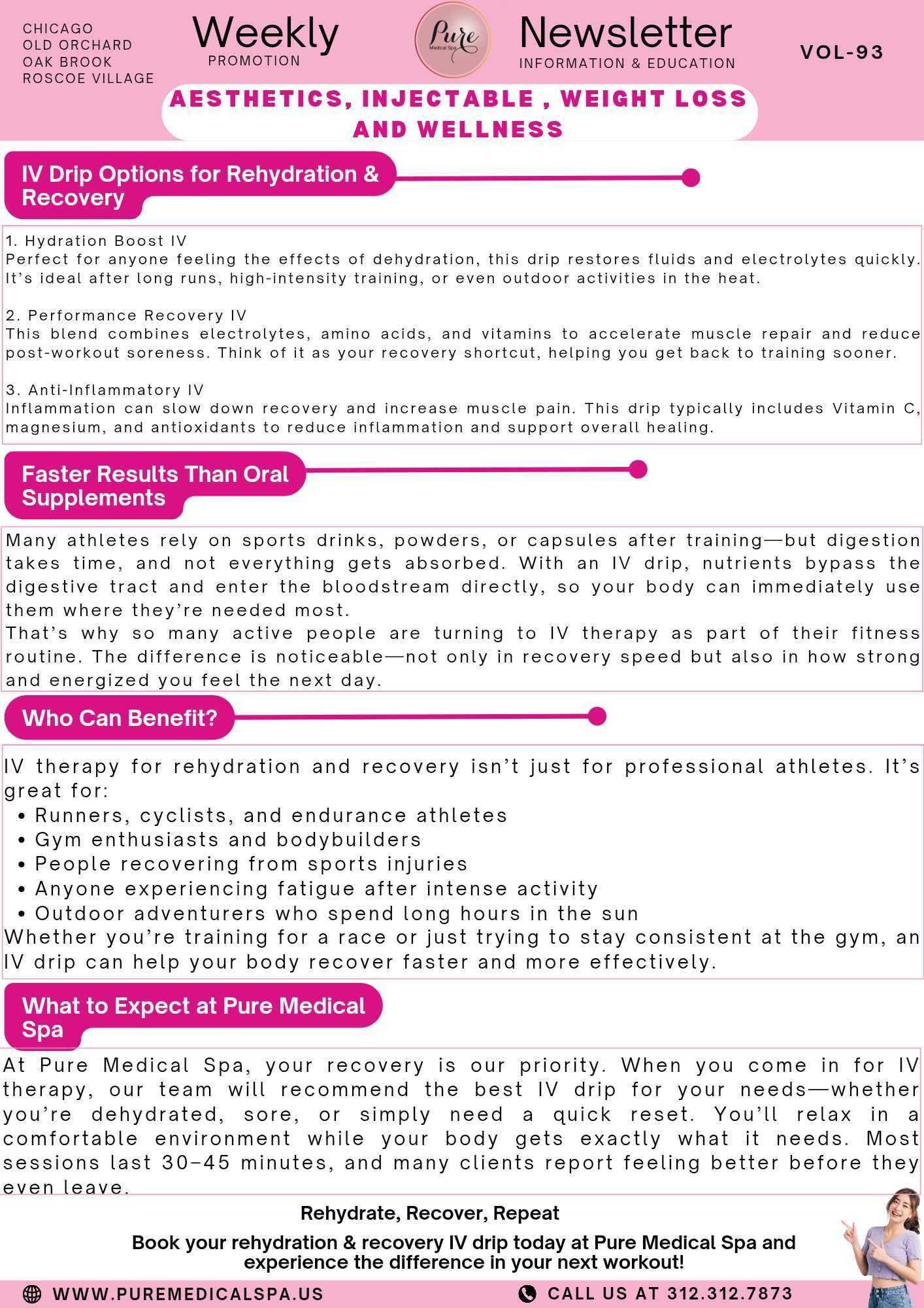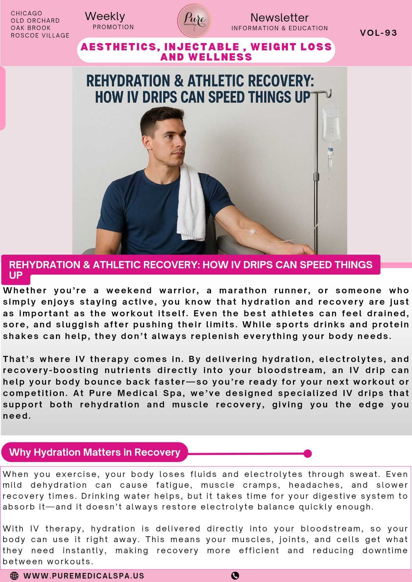 That’s where IV therapy comes in. By delivering hydration, electrolytes, and recovery-boosting nutrients directly into your bloodstream, an IV drip can help your body bounce back faster—so you’re ready for your next workout or competition. At Pure Medical Spa, we’ve designed specialized IV drips that support both rehydration and muscle recovery, giving you the edge you need.