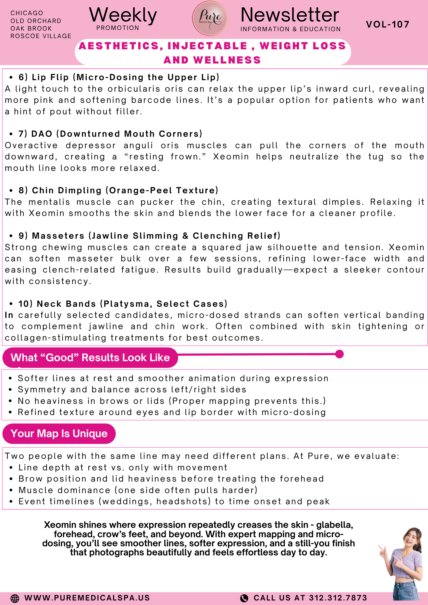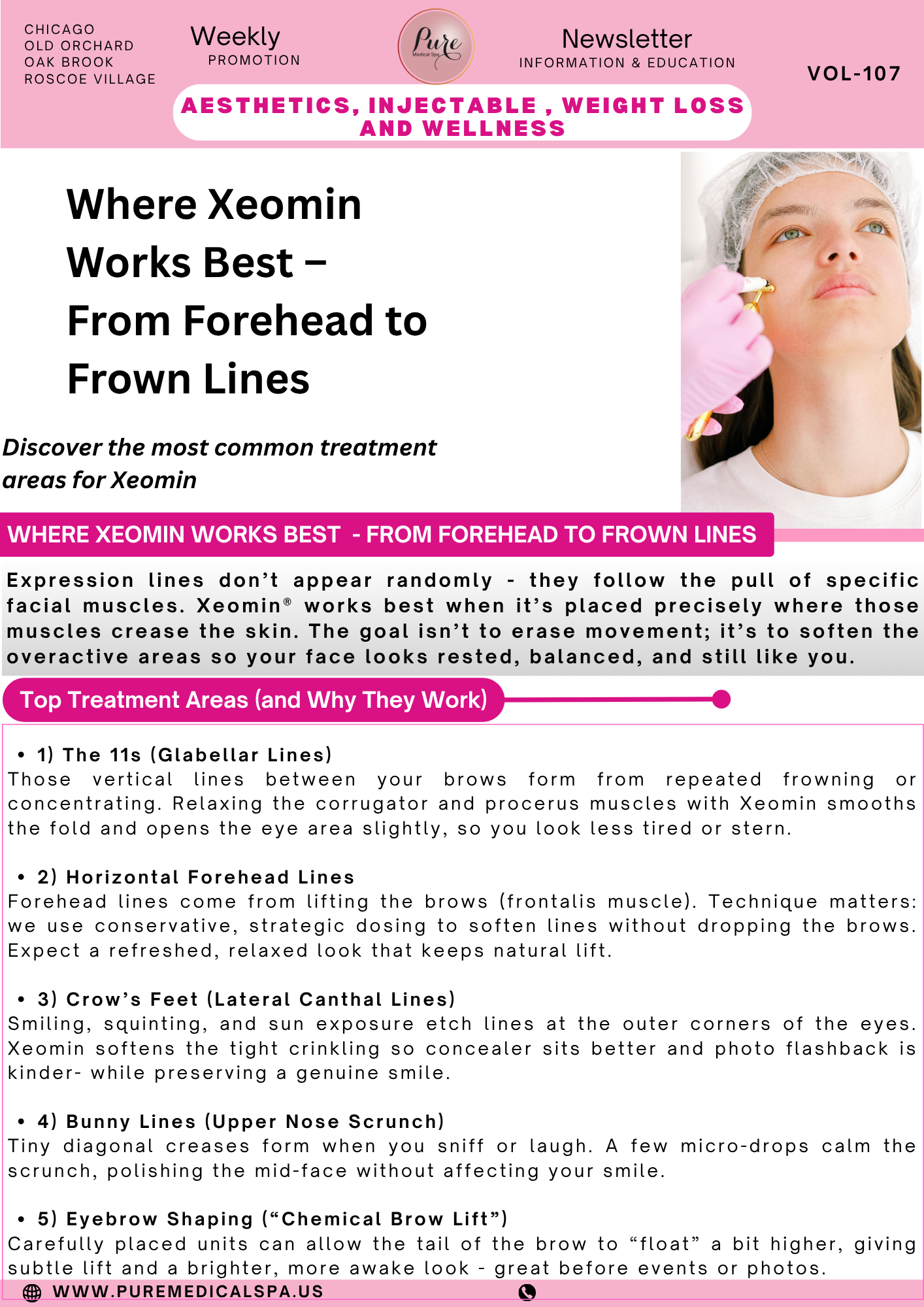 Book a consult at Pure Medical Spa-River North (N. Dearborn), Old Orchard/Skokie, Oakbrook, or Roscoe Village. Our injectors tailor Xeomin to your anatomy and goals for refined, natural results.