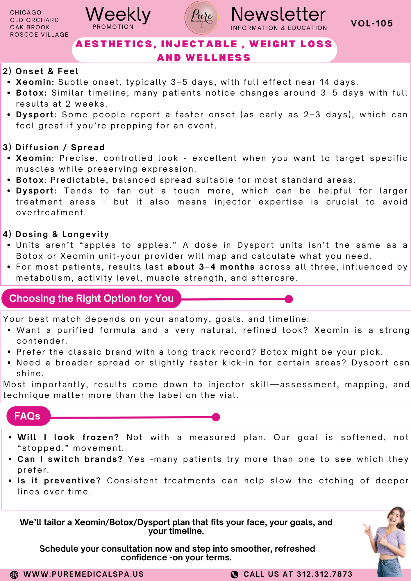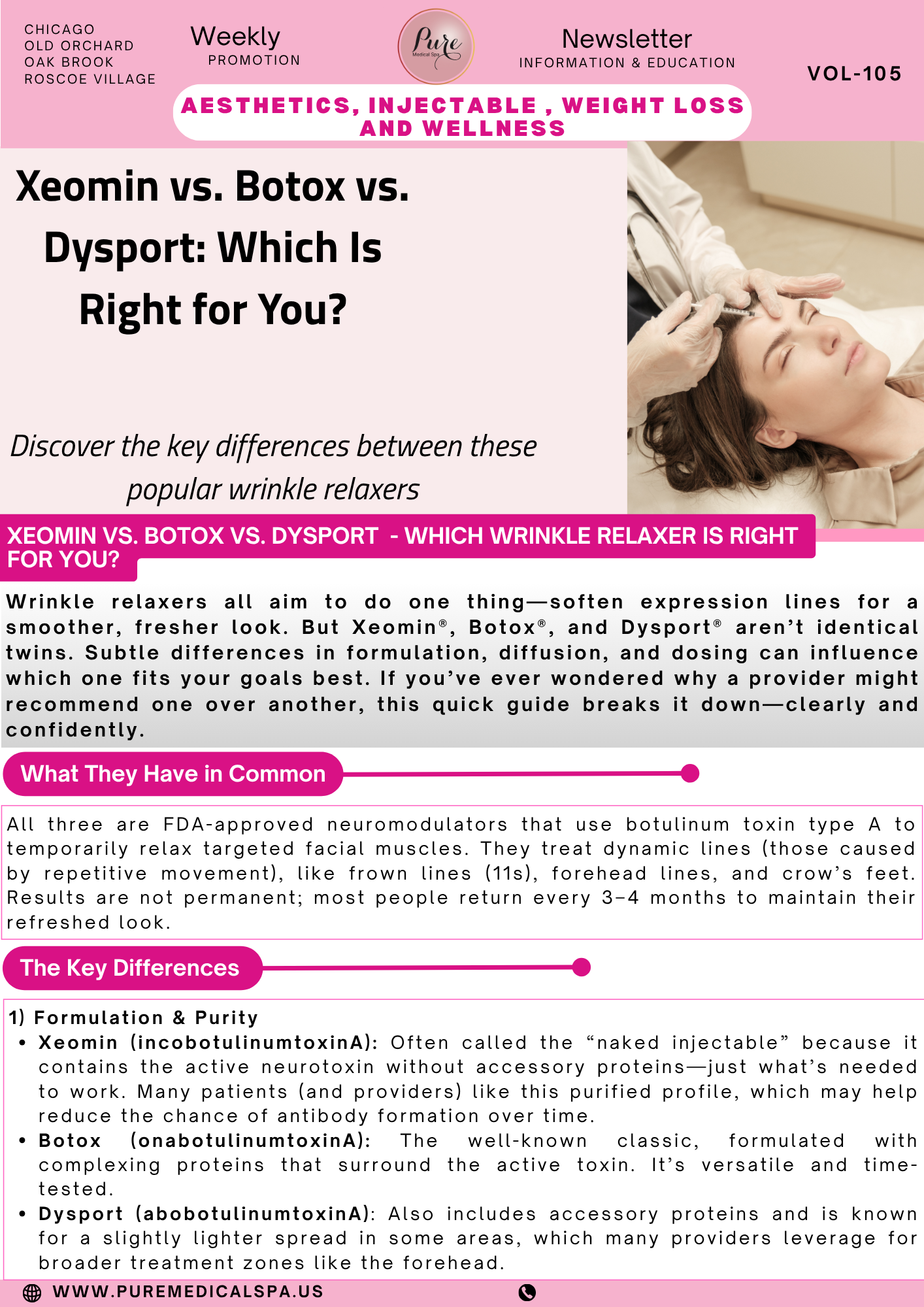 Book a personalized consult at Pure Medical Spa-River North (N. Dearborn), Old Orchard/Skokie, Oakbrook, or Roscoe Village. We’ll tailor a Xeomin/Botox/Dysport plan that fits your face, your goals, and your timeline.
